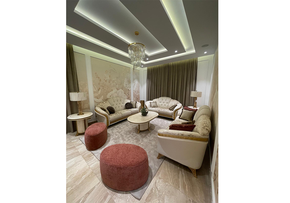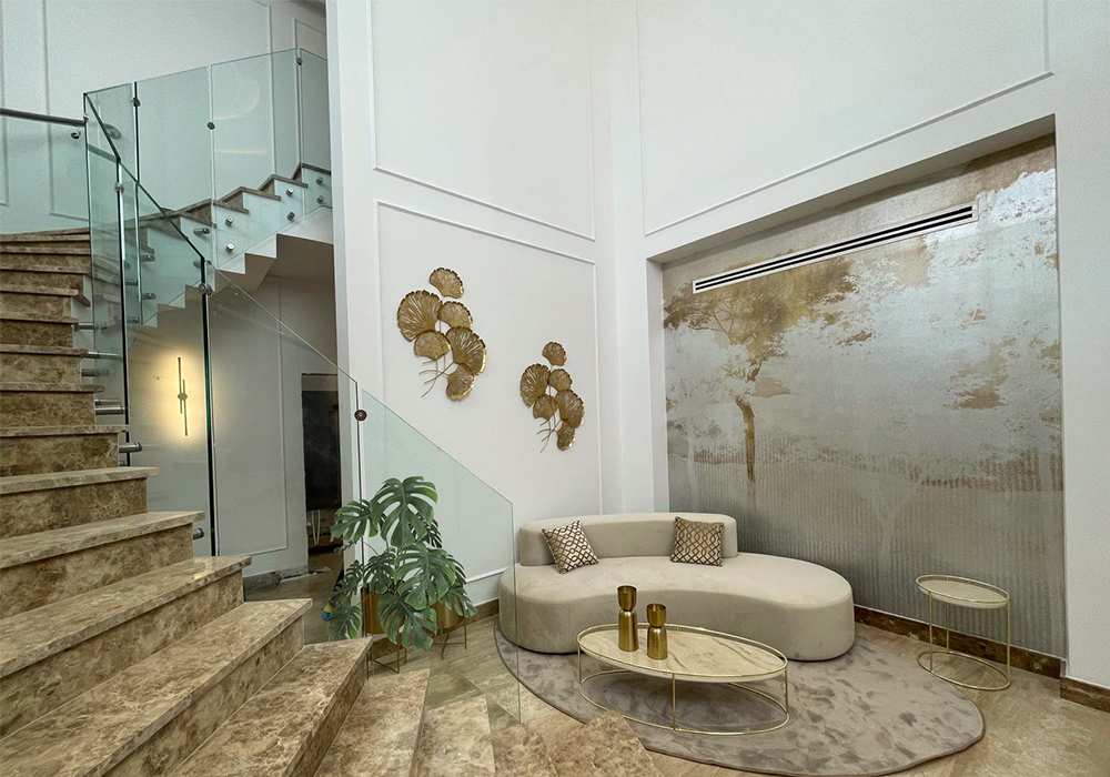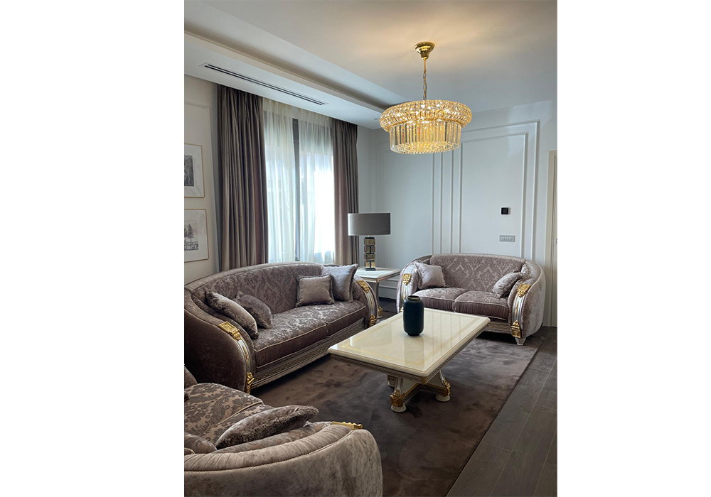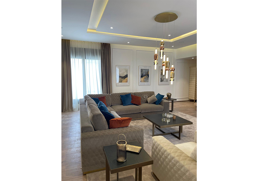 La villa, sviluppata su due piani, si caratterizza per uno stile classico con arredi dalle forme morbide, in cui tessuti con una palette di colori caldi e neutri si alternano a preziosi metalli dorati.