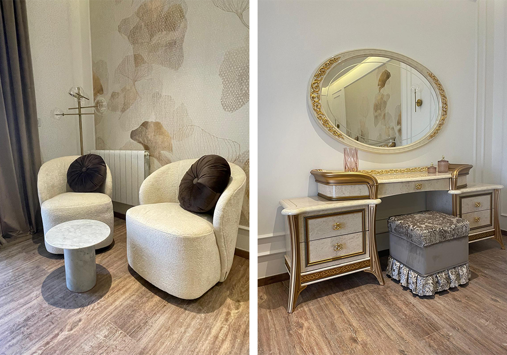 Un’attenzione particolare va dedicata alla progettazione dei rivestimenti, studiati ad hoc per caratterizzare e rendere unica ogni stanza. A seconda della destinazione d’uso, infatti, si alternano carte da parati materiche e tridimensionali a delicati motivi floreali, fino a grafiche dove la finitura metallica dorata ne è l’assoluta protagonista. Il tutto scandito dal ritmo geometrico delle cornici, in un delicato equilibrio tra classico e contemporaneo.